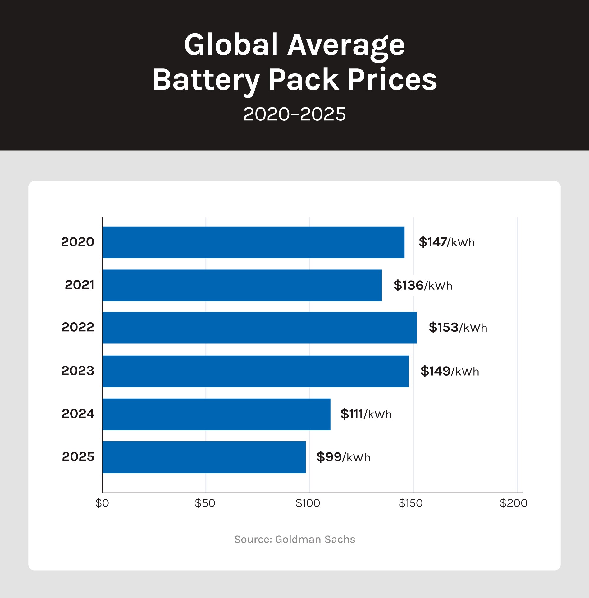Over the last decade, advances in EV battery technology have been the single biggest driver of declining replacement costs. Goldman Sachs projects that battery pack prices could fall to $70 per kilowatt-hour in 2025, down from $111 in 2022, a drop of roughly 37 percent as technology and manufacturing efficiency improve.