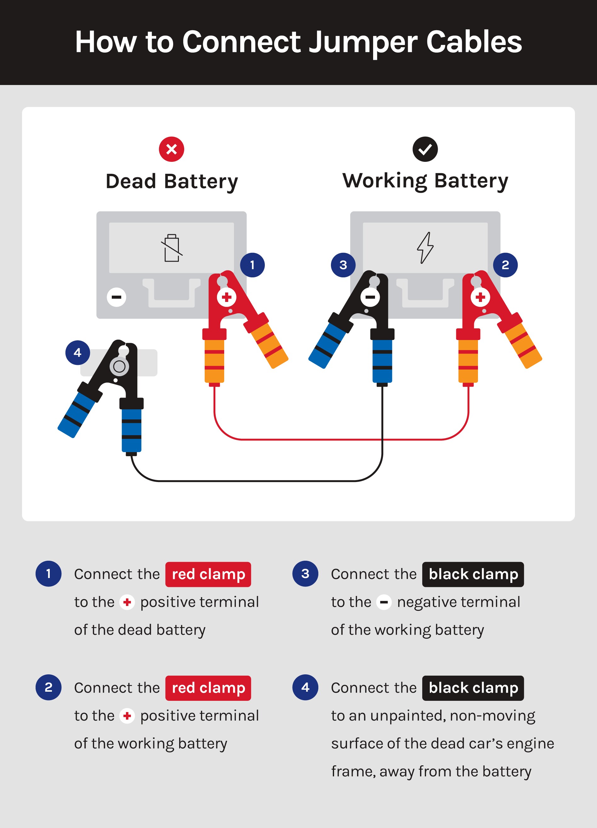 Connecting the jumper cables correctly is important, as you'll want to avoid any potential sparks. The recommended order for how to connect jumper cables is a professional one designed to keep sparks far away from the battery: