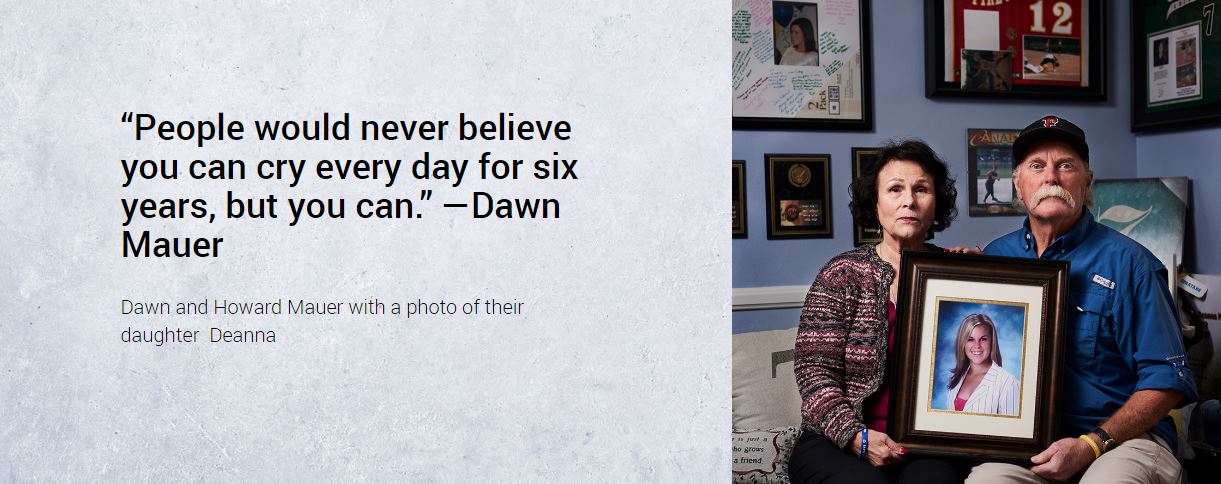 The cause of Deanna’s death? “Our daughter was killed by texting and driving,” says her mother, Dawn Mauer. She now has a tattoo of her daughter’s handprint on her left shoulder so that, she says, “every morning it’s like Deanna has her arm around me.”