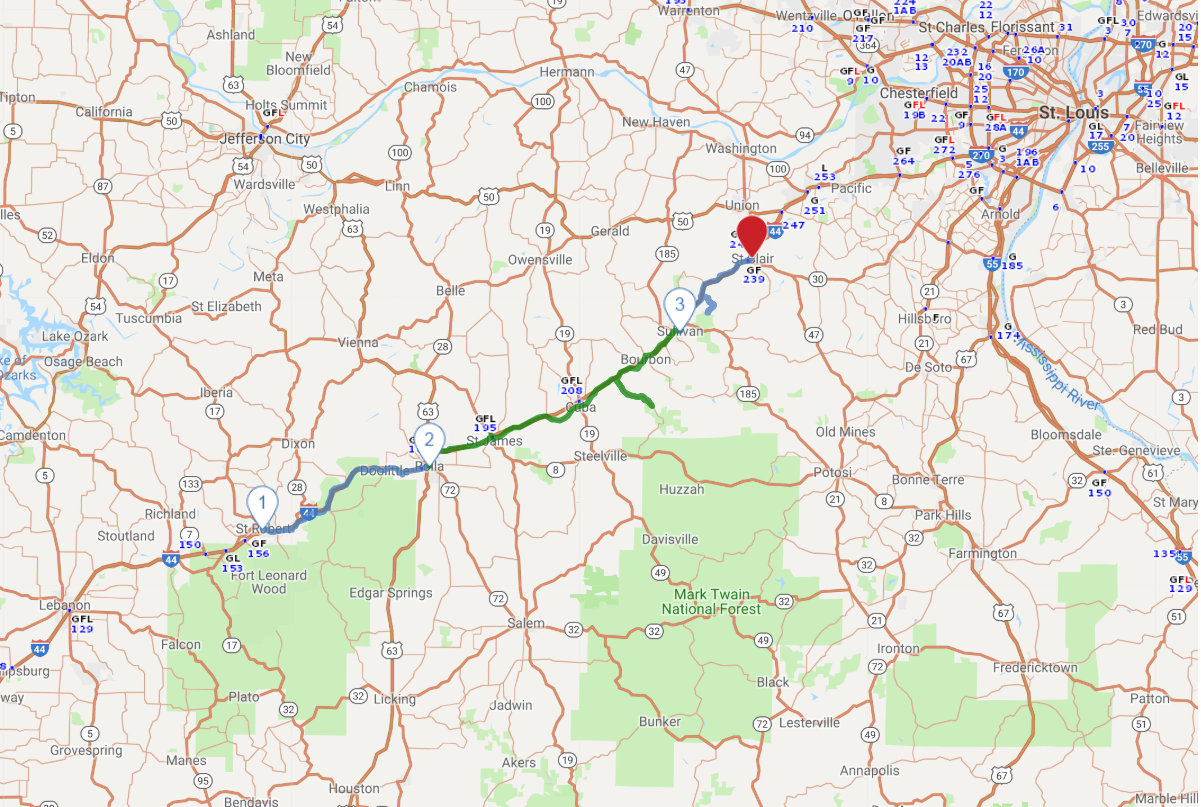An engineering triumph in its day, a 94-foot-deep cut in Hooker Hill resulted in a new four-lane section of Route 66 in 1942. Sadly, the realignment bypassed the Devil’s Elbow area, named after a perilous curve in the Big Piney River. Take a detour for breathtaking scenic views and timeworn landmarks, then continue eastward through a portion of Mark Twain National Forest.