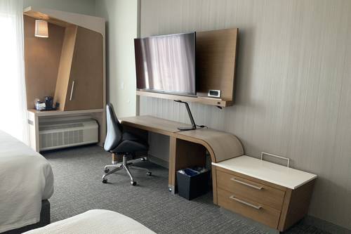 Contemporary guest room décor includes a work space on wheels, huge wall-mounted TV, bolster pillows in lieu of a headboard on the beds, and a serene gray color scheme throughout. Rooms with a king bed have a pull-out love seat, and many rooms have an oversize, walk-in shower in the brightly lit bathroom. The lobby bistro serves breakfast and light dinner fare daily. Relax by the fire pit on the patio.