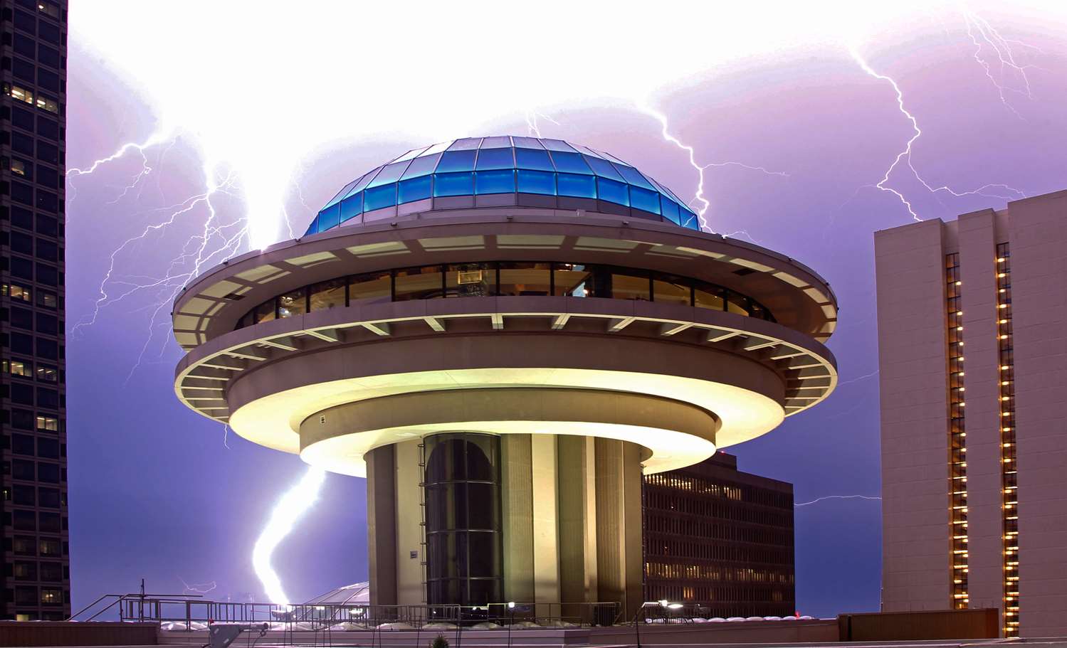 This hotel's blue dome atrium and massive three-tower structure has been a downtown landmark for decades. Pay close attention to the room type as sizes can vary drastically from tower to tower. Interior Corridors, 24 Stories, Smoke Free, 1260 Units